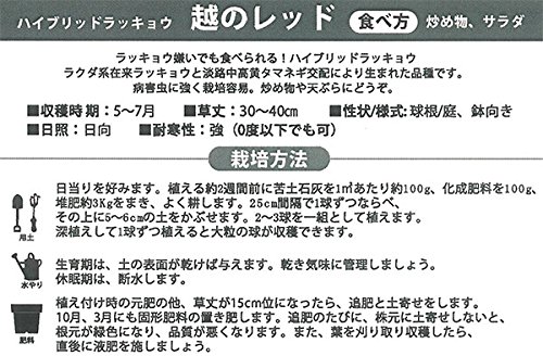 越のレッドは在来ラッキョウと淡路中高黄タマネギ交配により生まれた世界初のハイブリッドラッキョウとして話題になった品種。 外皮は透き通ったきれいな赤紫色で、シャキシャキした食感を持ち、とてもおいしい品種です。 炒め物や天ぷら、酢漬けなど、いろいろな料理に利用できます。 ラッキョウは肝機能の強化、高血圧の予防、血液さらさら効果もある健康野菜です。 プランターでも簡単に栽培できます。
