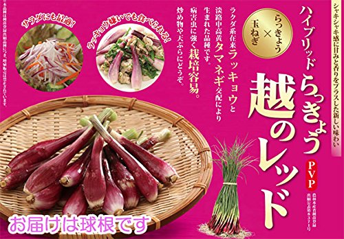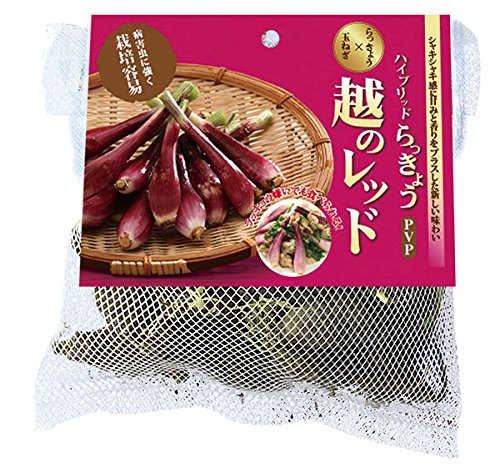 - 越のレッドは在来ラッキョウと淡路中高黄タマネギ交配により生まれた世界初のハイブリッドラッキョウとして話題になった品種。 外皮は透き通ったきれいな赤紫色で、シャキシャキした食感を持ち、とてもおいしい品種です。 炒め物や天ぷら、酢漬けなど、いろいろな料理に利用できます。 ラッキョウは肝機能の強化、高血圧の予防、血液さらさら効果もある健康野菜です。 プランターでも簡単に栽培できます。
