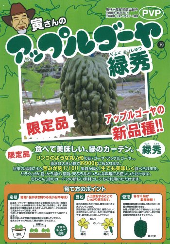 - 人気のアップルゴーヤの緑秀(緑実)と白秀(白実)の2種セットです。 セット内容:寅さんのアップルゴーヤ(緑秀)3号ポット×1株寅さんの丸くて白いアップルゴーヤ(白秀)3号ポット×1株<寅さんのアップルゴーヤ(緑秀)>世界発究極の上里アップルゴーヤ(緑秀)りょくしゅう。 緑秀はまるで、陶器で出来ているような輝きです。 寅さんのアップルゴーヤ。 食べて美味しい、緑のカーテン。 リンゴのような丸い形の新・ゴーヤ「アップルゴーヤ」。 重さは大きいもので約900gにもなります。 従来の品種に比べ苦みが約10分の1。 果肉が厚く、生でも美味しく食べられます。 サラダ、炒め物、から揚げ、漬物、天ぷらなどいろんな料理にお使いいただけます。 もちろん、緑のカーテンの新しい素材としてもご利用いただけます。 寅さんのアップルゴーヤの特徴!●リンゴのような丸い形●大きい物は約900g●苦みが約10分の1収穫時期:7月中旬頃~(5月中旬頃の定植場合)※地域や栽培環境により収穫時期は前後します。 栽培方法:鉢植え、プランター栽培は大きめな容器(用土10リットル)に1