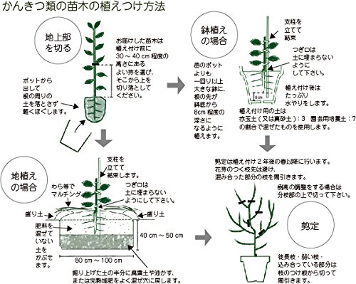 - お届けする苗は5号(直径15cm)ポット植えの接木1~2年生苗です。写真は成長時のイメージです。樹高につきましては、お届け時期により多少前後することがあります。また苗の性質上、お届け時期により葉に変色や虫食いの跡がある場合がありますのでご了承くださいませ。 ※柑橘類の苗は入荷時にトゲで葉に傷がついたり、多少の虫食いの痕がある場合がございます。またハウス養成品は養成過程で生じる現象で葉が波打っていたり丸まっていたりする場合がございますが、生育には問題ございませんのでご了承ください。
