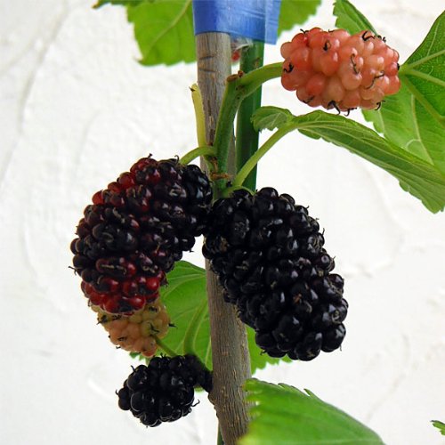 - マルベリーは昔懐かしい桑の実。欧米ではブドウのように発酵させて果実酒もつくられます。カタネオはイタリア原産のカラヤマグワ系品種。生育旺盛で樹形は直立性です。実付きがよく高い収量が期待できます。実は晩生で黒紫色。果重約2~4gで大粒です。糖度は9~11%で食味は良好です。1本で結実します。