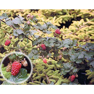 ラズベリーとブラックベリーを交配して生まれた木いちごです。花は白、実は写真のように普通のラズベリーよりも細長く大きくなり、はじめは黒緑ですが、熟すに従い徐々に赤く変化します。香り高く、完熟すると甘みも強くておいしい品種です。ジャムなどに加工しても独特の風味があり、美味です。茎にはとげがあり、つる状によく伸びますので、生垣やフェンスに這わせて動物よけなどにも適しています。自家結実性です。