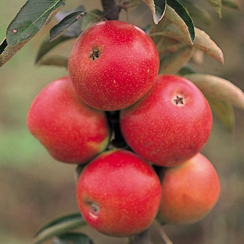 バレリーナツリーはユニークな姫リンゴ。お庭のシンボルツリーとして人気です。横枝があまり伸びず、花も果実も幹の周りに密生します。60cm四方のスペースがあれば栽培でき、鉢植えでも育てられます。木が大きくなると枝が斜め上方に伸びて細い箒型になります。春には赤く美しい花が咲き、秋には赤い実を実らせて、長期間楽しめます。お庭のワンポイントとして1本植えたり、数本並べても素敵です。自家結実性があるので1本だけでも実をつけますが、他品種を近くに植えていただくと収穫量を増やすことができます。