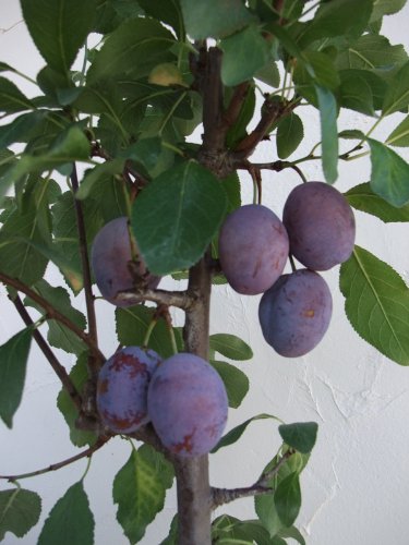 プルーンはすももの仲間。 西アジア原産の品種が欧米で改良されたものです。 生食、干し果、ジャム、ぷルーンエキスなどに幅広く利用されています。 ビタミン、ペクチン、鉄分、カルシウム、カリウムなどのミネラルが豊富で、とても栄養価の高い果物です。 すももに似て栽培は容易ですが、日照時間が多く雨の少ない場所が栽培に適しています。 自家受粉しますので、1本でも実がつきますが、受粉樹として違う品種を2本以上うえていただくとより実つきがよくなり、多く収穫できます。 以下の2品種をセットにしてお届けします。 セット内容:スタンレー4~5号ポット×1プレジデント4~5号ポット×1スタンレーたいへん甘くて多汁質、食味良好で日持ちのよい品種です。 果実の大きさは40~50g、糖度15~18度です。 果皮は鮮やかな濃紫色です。 樹勢旺盛で豊産性、自家結実性の強い品種です。