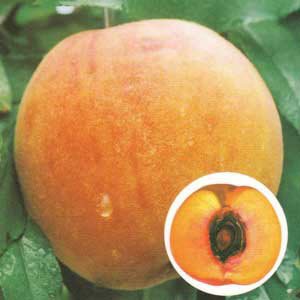 ゴールデンピーチは晩生の黄肉品種で、黄色みを帯びた果肉で大玉。 果重300g、糖度は12~13%と比較的高い品種です。 酸味は少なく、果肉はとろけるようですが、やや固めです。 裂果の発生はみられません。 収穫は8月下旬~9月上旬で黄金桃よりも遅めです。 自家結実性ですので、1本で実が楽しめます。