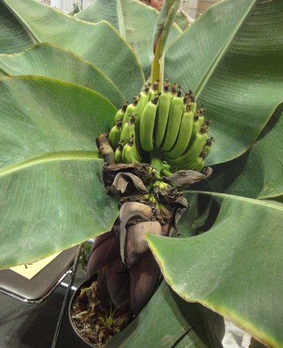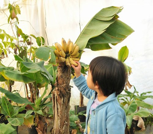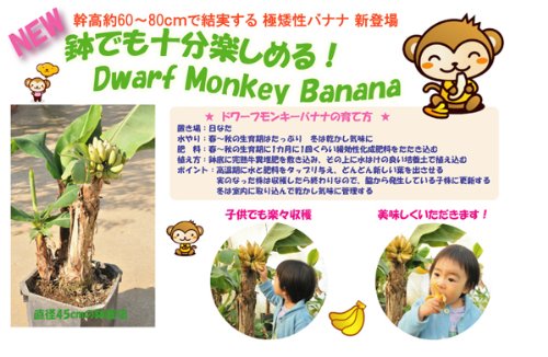 - 幹高60~80cmで結実する極矮性のバナナ。 鉢植えでも十分楽しめます!とても実つきの良い品種で、この苗を成長に応じて6号~10号(直径30cm)鉢に植え替えながらよく日の当たる場所で管理し、十分に肥料と水を与えながら育てれば、1年~1年半で開花・結実します。
