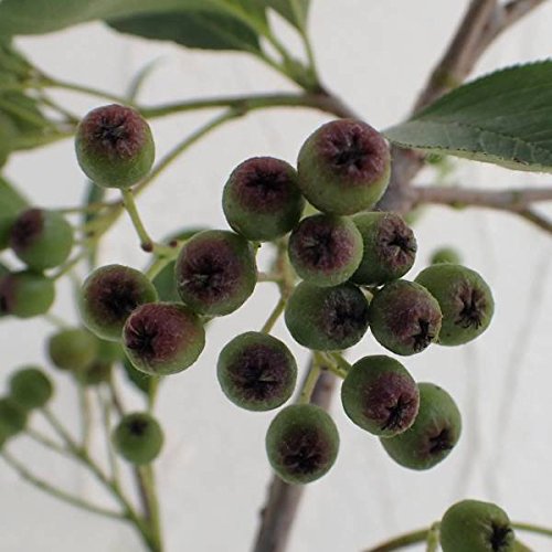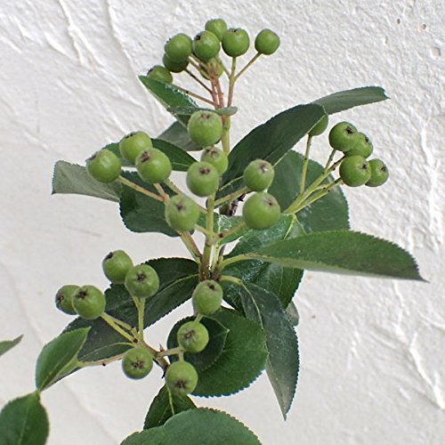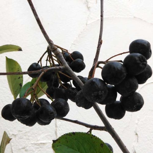 - 5月頃に小さな5弁の白花を咲かせ、ブルーベリーに似た黒い果実をつけます。実は夏の間は緑色で、秋~冬に黒く熟します。秋になれば紅葉もし、花、実、紅葉と3拍子そろった見どころの多い庭園樹として人気が高まっています。果実は生食はできませんが、アントシアニンを多く含み、健康食品やジャム、果実酒、アイスクリームなどに利用されています。庭木、寄せ植え、ボーダー花壇にも適しています。1本で結実します。タイプ:バラ科の耐寒性落葉低木開花期:5月熟期:10~11月樹高:1~2m内外栽培方法:日当たりのよい場所に腐葉土などをすきこんで植え付けてください。鉢植えでも栽培できます。実が黒く熟したら収穫してください。4.5号(直径13.5cm)ポット入り、樹高約40~50cm前後の苗です。樹高につきましては、お届け時期により多少前後することがあります。お届け時期により葉がきれいでない状態の場合がございます。写真は結実時のイメージです