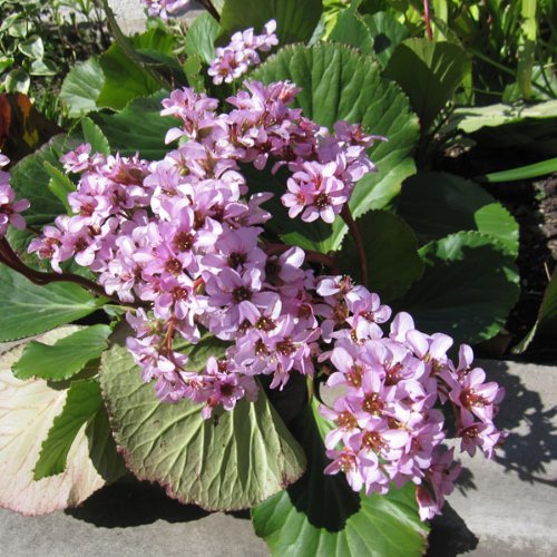 - ヒマラヤユキノシタの名前で常緑の大きな葉と太い茎を持ち、春にピンクの小花を房状に咲かせます。寒さにたいへん強く、ロックガーデンや石組みの間の植え込みに似合います。また、鉢植えにも適しています。