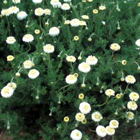 ローマンカモミールの八重咲き種。全草にリンゴににた甘い香りがあります。春と秋にさわやかな香りを放つ小さな白い花をたくさん咲かせます。花を摘み取ってハーブティーにします。生でも乾燥でも利用できますが、ハーブティーには鎮静作用があり、眠りを誘うハーブと呼ばれています。また、ハーブバスに利用したり、花の浸出液をローションとして利用すると肌を柔らかくするといわれています。草姿がコンパクトなので、芝生がわりにグランドカバーとしてよく利用されます。