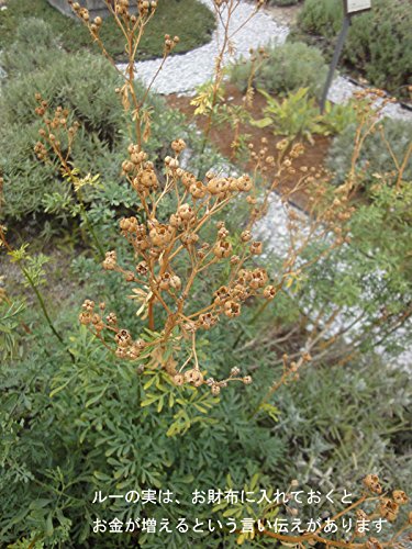 - 香りのよい常緑多年草です。 昔は薬草として利用されましたが、現在は園芸用に庭植えにされます。 独特の香りは虫除け(ハエや害虫を防ぐ)の効果があると言われています。 小さな黄色の花が集まって咲き、さわやかな印象です。 ヨーロッパではその後にできる実を摘み取って財布に入れておくとお金がたまる、といわれています。