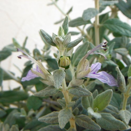 シルバージャーマンダーとも言われる地中海沿岸産の半耐寒性(マイナス10度まで)常緑低木です。同じジャーマンダーでも草本のものはウォールジャーマンダーと呼ばれます。シルバーの葉に特徴のある大きなブルーの花が美しく、刈り込みして生垣にするとすばらしい品種です。ハーブとして料理やティーに利用できます。タイプ:シソ科ニガクサ属の半耐寒性常緑低木開花期:6~8月草丈:50~150cm日照:日向むき用途:花壇、鉢植え、生垣育て方:日あたりのよい場所で、水はけのよい土で育てます。半耐寒性なので-5度までで管理します。最低気温が-0度以下になるところでは、コンテナ栽培にし、冬は室内に入れます。生垣にする場合は晩春に刈り込みをしてください。利用方法:ハーブとしては、食用、薬用に利用できます。花をサラダに散らしたり、葉はティーとして薬用にすると利尿・殺菌作用があります。また花がかわいいので切花としてもおすすめです。直径9cmポット植えです。