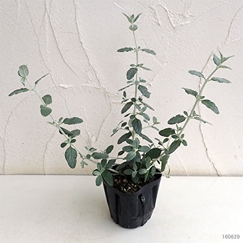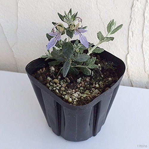 - シルバージャーマンダーとも言われる地中海沿岸産の半耐寒性(マイナス10度まで)常緑低木です。同じジャーマンダーでも草本のものはウォールジャーマンダーと呼ばれます。シルバーの葉に特徴のある大きなブルーの花が美しく、刈り込みして生垣にするとすばらしい品種です。ハーブとして料理やティーに利用できます。タイプ:シソ科ニガクサ属の半耐寒性常緑低木開花期:6~8月草丈:50~150cm日照:日向むき用途:花壇、鉢植え、生垣育て方:日あたりのよい場所で、水はけのよい土で育てます。半耐寒性なので-5度までで管理します。最低気温が-0度以下になるところでは、コンテナ栽培にし、冬は室内に入れます。生垣にする場合は晩春に刈り込みをしてください。利用方法:ハーブとしては、食用、薬用に利用できます。花をサラダに散らしたり、葉はティーとして薬用にすると利尿・殺菌作用があります。また花がかわいいので切花としてもおすすめです。直径9cmポット植えです。