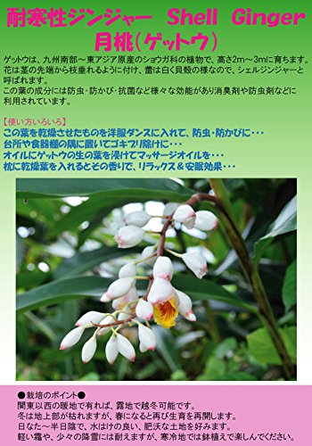- 冬は室内で越冬させれば、地上部が枯れても春には新しい芽が出ます。 この苗は千葉県産です。 タイプ:ショウガ科アルビニア属の非耐寒性多年草 学名:Alpinia zerumbet 耐寒性:3度以上 草丈:2~3m 日照:日向~半日陰むき 栽培方法: 春から秋は戸外の半日陰となる場所が最適ですが、室内の明るい場所でも管理できます。 水を好むので夏場はたっぷり与えてください。 冬は控えめにします。 生育期には観葉植物用の液肥などを適宜与えてください。 冬に戸外で霜にあたると地上部は茶色くなり枯れますが、根は生きていますので翌年の5月ごろには新しい芽が上がってきます。