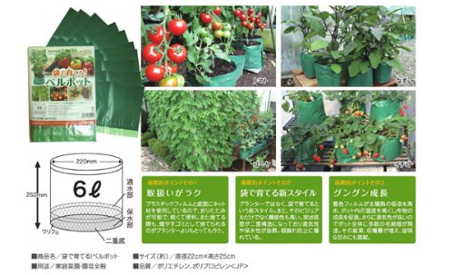 - 水はけ抜群!根腐れを防ぐプロの農家も使用している袋栽培用のプランターです。 セット内容: ベルポット6リットル用10枚セット[家庭菜園におすすめ!] × 2セット(合計20枚) ●根腐れ対策プランターとは?
