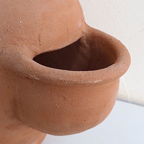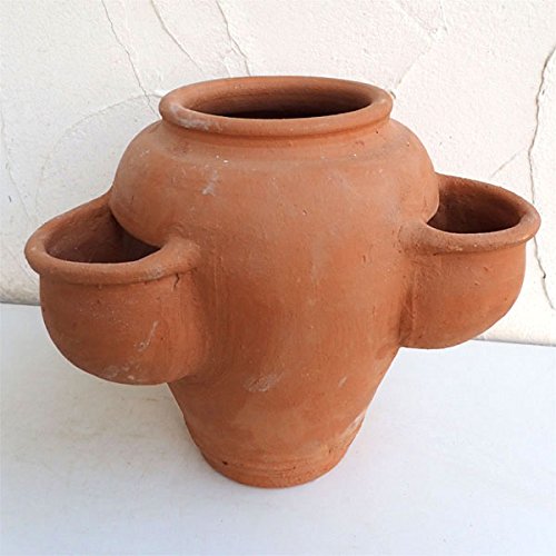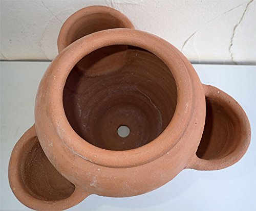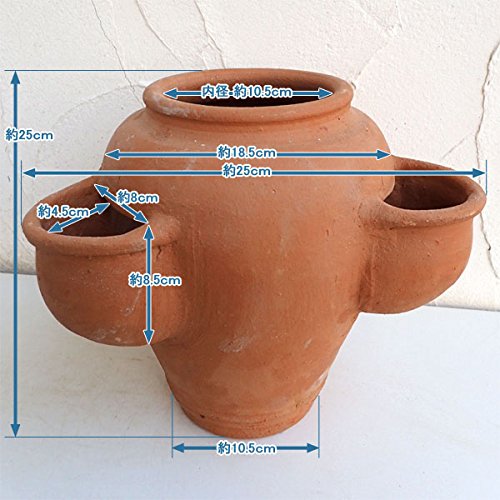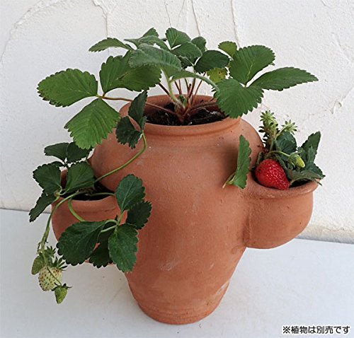 - イチゴの栽培用に作られた素焼き鉢、ストロベリーポット。小さなポケットをいくつも持ったこのポットは、いろいろな種類の植物を1つの器で楽しめます。これは上と周囲のポケット3つ、てっぺんとあわせて合計4箇所に植えられるもの。お料理に使えるいろいろなハーブを取り合わせれば、キッチンガーデンにピッタリです。イチゴを栽培する場合は、一番上の穴にイチゴの苗を植え、伸びてくるランナーの子株をポケットに入れて根付かせる、という形で栽培します。サイズ:胴回り(ポケットを含まない)の最大直径18cm、頂部口径10.5cm、高さ25cmポケット3個付き(ポケット内寸幅8cm、奥行き4.5cm)素材:テラコッタ(素焼き陶器)※写真はイメージです。