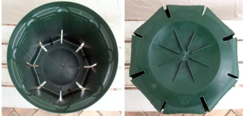 とんでもないポット(スリット鉢)は、プロの果樹・樹木の栽培農家で愛用されている、多年栽培用ポットです。シンプルでありながら特殊な構造によりこれまでにないほど長い年数の栽培に耐えることが実証されています。ご家庭での花木や果樹の栽培にもおすすめです。鉢底裏の特殊構造により、根の旋回現象(サークリング)を防止し、鉢内のみで健全な根形を形成します。また、用土内の水分を均一化し中心部に多くの根を育成し、コーナーと側面の段差により、根を下方へ誘導します。弾力性のある軟質ポリ素材なので、樹皮の損傷を防止します。色合いも落ち着いていますので、デザイン鉢感覚で利用できます。色:モスグリーン形状:8角形サイズ:外径30.0cm、底径25.5cm、高さ26.5cm土容量:約12.8リットル実用新案登録済・特許申請済