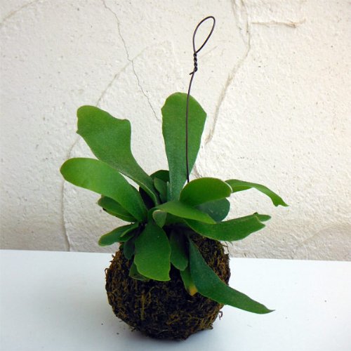 - コウモリランの苔玉仕立て、スタンド付きです。 こうもりが羽を広げた様な葉の形が印象的な着生シダで、和名の「ビカクシダ」は鹿角(びかく)と言う様に、葉の形状が鹿の角に似ていることから名づけられたようです。 エキゾチックな観葉植物としてお楽しみください。 タイプ:ウラボシ科のビカクシダ属原産:オーストラリア・ニューカレドニア等の温帯雨林や熱帯雨林生育適温:20~30℃耐寒性:乾燥気味で0℃日照:半日陰を好むサイズ:コウモリラン:苔玉径7cm、幅約12cm、高さ約13cm(針金まで18cm)※植物により個体差があります。