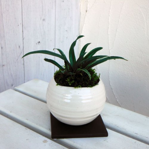 [縁起物・新居祝いやギフトに!]万年青 (おもと) 白丸型陶器鉢Sサイズ植え・角受け皿付き