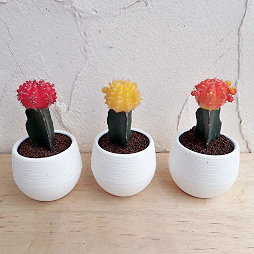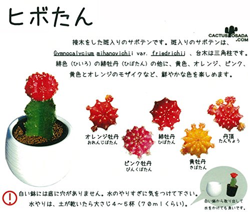 色鮮やかな丸いヒボタン。上と下で色・かたちが違うのは接ぎ木によるもので、台木は三角柱サボテンです。柱サボテンの緑とカラフルなヒボタンのコントラストがポップで可愛らしいですね。黄・オレンジ・赤の3色セットでお届け致します。 タイプ:サボテン科ギムノカリキウム属のサボテン植物 耐寒温度:7℃以上 管理方法: 日当たりを好みますが、柔らかな日を長い時間当てることを好みます。真夏の強光線は日焼けに注意してください。 水やりは春~秋までは土が完全に乾いてから1週間ほどおいてから、たっぷりと与えます。冬は1か月に1回程度でごく控えめにします。一般的なサボテンよりやや寒さに弱いため、冬季は7度以上を保つよう管理してください。 お届けするのは3号ポット入り3色セット、草丈約8cmです。 ※写真はイメージです。