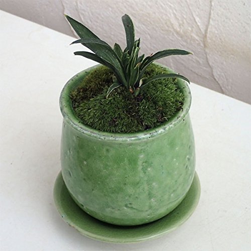 - 小さなオモトを釉薬の色も美しい陶器鉢に植えこみました。 ギフトにオススメです。 古来から、オモトを植えると災難を防ぎ万年も家が栄えつづけるとされ、引越しの際新居の玄関にオモトを飾ると縁起がよいと言われています。 寒さに強く、戸外で冬越しでき、室内の明るい場所でも栽培できます。 オモトはキジカクシ科(スズラン科・ユリ科)オモト属の常緑多年草で、冬も枯れずに年間を通して青々と美しい姿が鑑賞でき、不老長寿の象徴ともされています。 株が成熟すると5~6月に白い小花が咲き、秋に橙色のきれいな実がつきます。 鉢:直径11cm、高さ11cm、陶器製、底穴あり・受け皿付