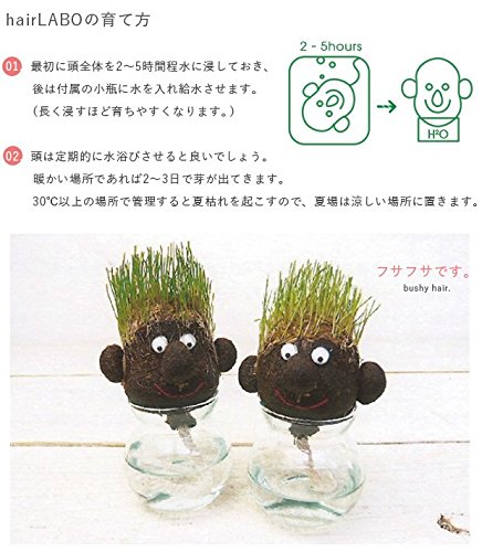 - 育て方・楽しみ方: パッケージから出したhair LABOの本体をまずはお水を入れたボールやバケツに3時間ほど浸けて本体全体に水をたっぷり吸収させます。しっかり吸水させると発芽率がアップします。その後、付属のガラス容器にセットして、発芽するまではガラスのお水がなくならないように注意して、本体が乾かないよう霧吹き等で毎日しっかりと湿らせてください。発芽し始めたらその後は1週間に2回ほどキリフキ等で本体をしっかり湿らせ、ガラス容器にいつもお水が入っている状態にします。ある程度伸びてきた葉はハサミで定期的にカットしてあげてください。そうすることにより長く楽しんでいただけます。頭や顔の部分に白い糸のようなものが多く出てくる場合が有りますが、それは「根」なので心配ありません。