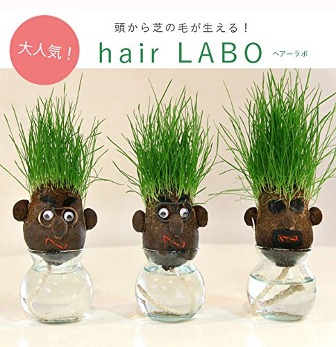 口ひげ&真っ黒サングラスに、インテリメガネ。やんちゃなボーイズ3人組でお届け致します。「何気なく目に入った瞬間に思わず“クスッ”と笑ってしまう…」それがhairLABOのコンセプト。まるで頭から毛が生えているかのように、頭頂部から芝が伸びてきます。ある程度髪の毛(芝)が伸びてきたら、ハサミで好きなようにカット!ショートヘアーやハードロック、たまねぎ頭まで色々な髪型を楽しんで頂けます。サイズ:9cm(本体)栽培方法:最初に頭を2時間程水に浸しておき、後は付属の小瓶に水を入れ給水させます。頭は定期的に水浴びさせると良いでしょう。暖かい場所であれば2~3日で芽が出てきます。30℃以上の場所で管理すると夏枯れを起こすので、夏場は涼しい場所に置きます。伸びた草を短くカットしたら液体肥料を与えます。※最初に頭をしっかりと水に浸しませんと発芽しない場合がございます。ご注意ください。表情などそれぞれ個体差があります。