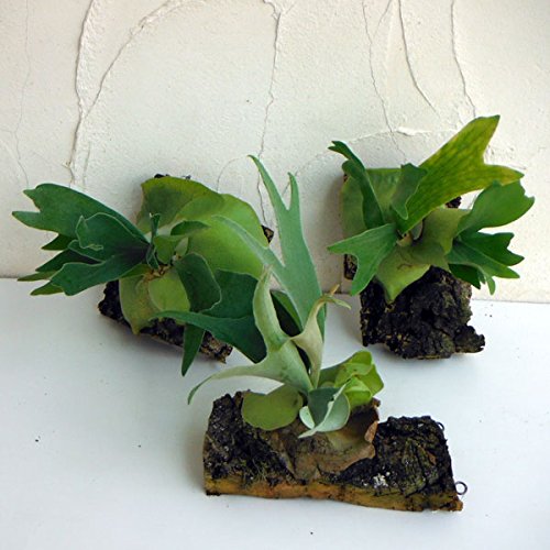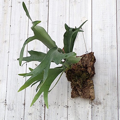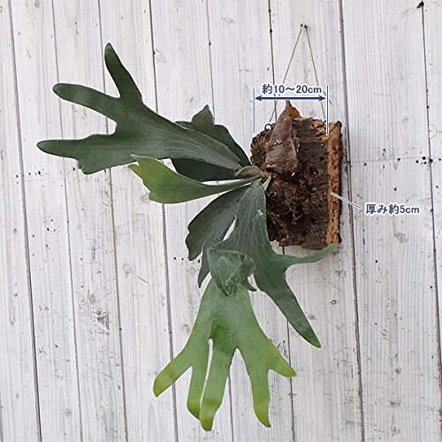 - コルク仕立てのコウモリラン。 天然のコルク板で仕立てることにより、ヘゴ仕立てでは乾き過ぎる根を守ることができます。 コルク板にしっかりと根付いた状態でお届けしますので、このまま壁面に吊り下げて飾っていただけます。 こうもりが羽を広げた様な葉の形が印象的な着生シダで、和名の「ビカクシダ」は鹿角(びかく)と言う様に、葉の形状が鹿の角に似ていることから名づけられたようです。 エキゾチックな観葉植物としてお楽しみください。