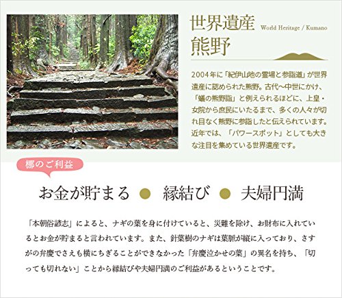 - 「ナギ」はその名が海の穏やかな状態である「凪」に通じるとして、古来から航海の安全や日々の生活の安全を祈る魔除けのお守りとされてきました。ナギの葉を身に付けていると、災難を除け、お財布に入れているとお金が貯まると言われています。また、針葉樹のナギは葉脈が縦に入っており、さすがの弁慶でさえも横にちぎることができなかった「弁慶泣かせの葉」の異名を持ち、「切っても切れない」ことから縁結びや夫婦円満のご利益があるということです。