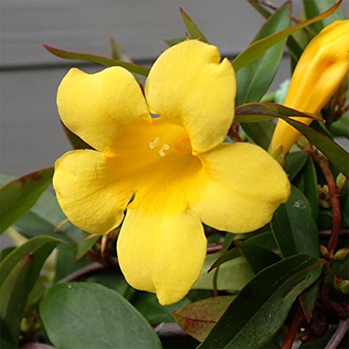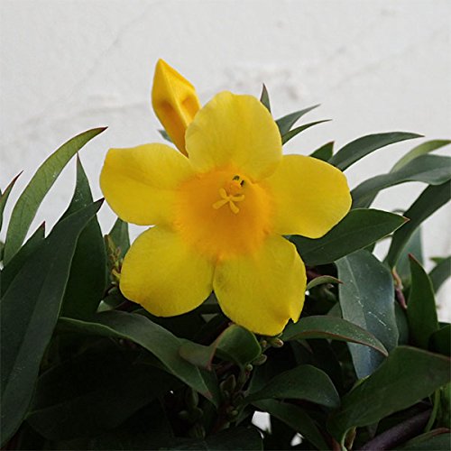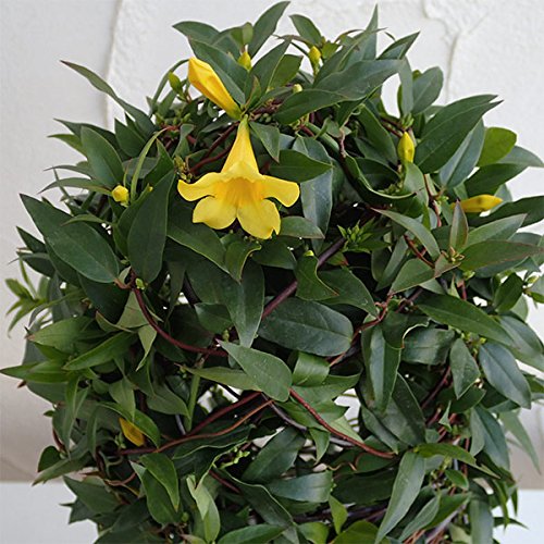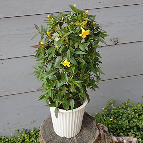 - 黄色の香りのよい花を咲かせるカロライナジャスミンはつる性植物のなかでも人気の品種です。 アメリカのカロライナ州近辺原産で、黄色い5弁の花を木いっぱいにさかせ、あたりを甘い香りで包みます。 露地栽培での開花時期は3~5月頃ですが、この鉢植えは温室で促成栽培したものなので、今年は冬の間に花を咲かせます。