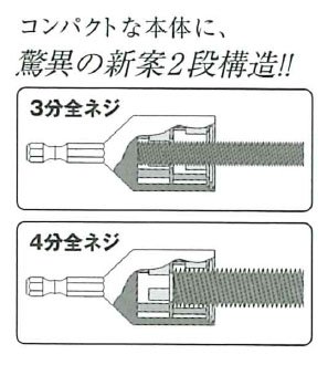【用途】全ネジボルト用ソケット。【機能・特徴】1台2役の3分・4分兼用です。正転逆転にも使用でき、ボルトの脱着に威力を発揮します。【注意事項】3分・4分以外のボルトには適合しません。回転に過剰な負荷をかけると全ネジの山部分を潰してしまうので、ご注意ください。建築用の一部の全ネジの中に規格より細い物がありますが、規格より細い物は本品のロック用ピンが働かず、うまく全ネジをつかめないことがあります。