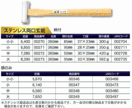 土牛 DOGYU 両口玄能 ステンレス両口玄能 頭のみ 小小 00346
