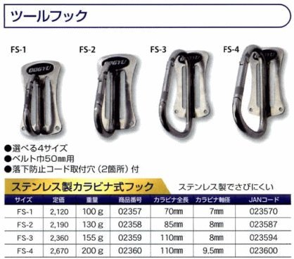 土牛 DOGYU ツールフック ステンレス製カラビナ式フック FS-4 02360