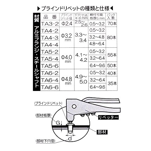 ●DIYに適したリベットパック。●リベットを適量のパックにしてあるので便利。●品番:TA4-4●ブラインドリベット径:直径3.2mm●下穴寸法:直径3.3~3.4mm●締め付け可能板厚:4.8~6.4mm●パック入数:80本●注意:本品はリベッターにセットして使用します。詳しい使用方法はリベッター本体包装の使用説明に記載していますのでご使用前に充分お読みください。リベットは本来の使用目的以外には使用しないでください。●アルミフランジ、スチールシャフト●製品サイズ:長さ120×高さ36×幅55、重量92g