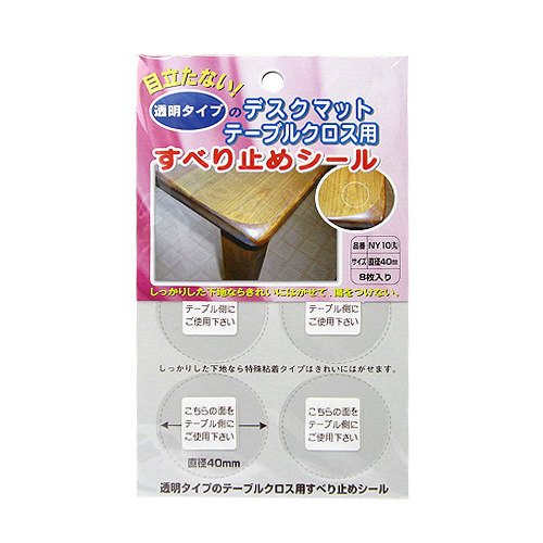 目立たない!デスクマット、テーブルクロス用のすべり止めシールです。【特長】・透明シールなので目立ちません。・はがした後にのり残りがなく、傷が付きません。 また、薄い為凹凸が出にくくなっています。【使用方法】(1)テーブルクロス用すべり止めシールです。 裏紙をはがしてテーブルクロスの裏に貼り付けます。(2)はく離紙をはがします。 (※はがしにくい時はセロテープを貼り、引き離すようにして下さい。)(3)テーブルクロスにすべり止めシールを貼った面をテーブルに付け、 テーブルクロスの上からシールを貼ったところを強く押えて固定します。