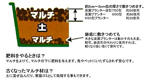 - 約2cm~3cm位の厚さで敷きつめます。/菜園プランター深型750型:約5ℓ使用 菜園プアンター 900型:約8ℓ使用 650型プランター:約3ℓ使用