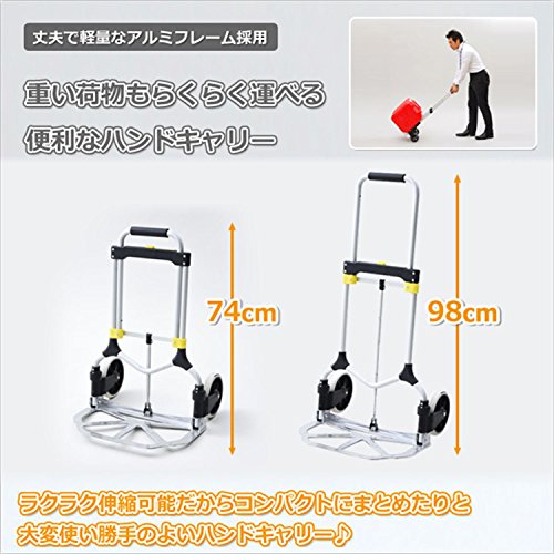 ●完成品です●重い荷物もらくらく運べるハンドキャリー●丈夫で軽量なアルミフレーム採用●大きい荷台で荷物が安定する●荷台サイズ:幅48.5 奥行27cm●折りたたみサイズ:幅50.5 奥行6.5 高さ74m●許容積載重量:90kg