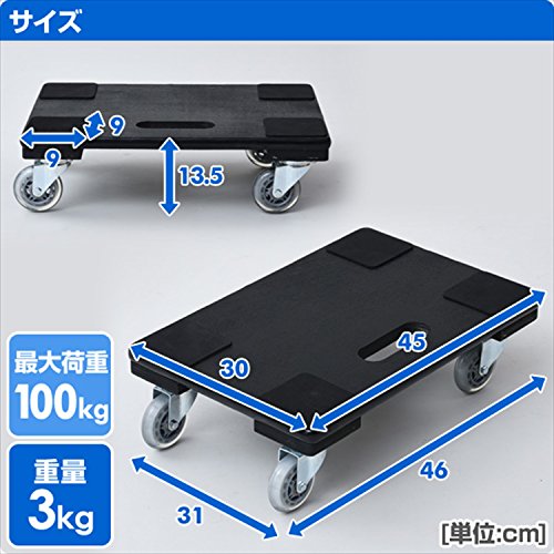 ●お得な4個セット●積載面:幅45×奥行30cm●最大荷重:100kg●滑り止めマットサイズ:9cm角●静音キャスターの木製平台車●天板滑り止めマット付きなので荷物のズレを防止します●家具の移動や家の様々なシーンで大活躍●スタイリッシュなブラック
