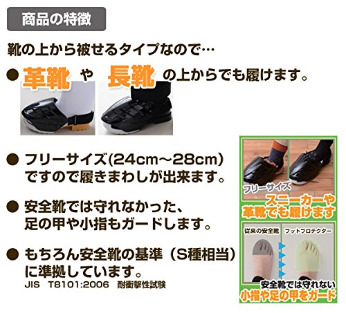 ●靴の上から被せるタイプ●スニーカーや革靴、長靴の上からでも履ける●安全靴では守れなかった足の甲や小指もガードします●日本工業規格の定めるS種相当の耐荷重・耐圧テスト合格※JIS規格 JIS T8101:2006(安全靴)●ベルトで簡単着脱●洗えて清潔※靴は付属しません