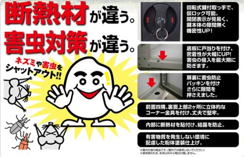 ●組立品です●組立時間:約60分以上●収穫後のお米の簡易保管に最適●お米をねずみや害虫・湿気より守る●結露が発生しにくい断熱材採用●前面四隅、裏面上部2ヶ所に立体的なコーナー金具を付け、丈夫で堅牢●回転式鍵付取っ手で、仮ロック可能。開閉表示が見易く、鍵本体の隙間無く機密性UP●扉裏に害虫防止パッキンを付けさらに隙間を押さえました●底板に戸当りを付け、密着性が大幅にUP!害虫の侵入を最大限に防ぎます●玄米収納容量:30kg紙袋×18袋●耐荷重:540kg●有効開口部:幅116×高さ112cm※屋内の商品です