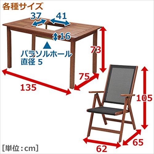 - [本体サイズ]テーブル:幅135×奥行75×高さ73cm 重量19.5kg / チェア:幅62×奥行65×高さ105cm[重量]8kg
