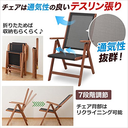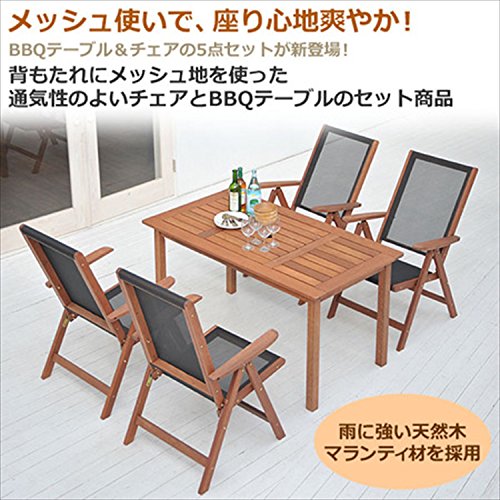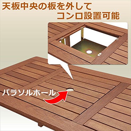 ●組立品です●天然木マランティ材を基調に仕上げたテーブル&チェア●天板中央の板を外すとコンロの設置が可能●お庭でのバーベキューが便利です●チェアは通気性の良いテスリン張り地を使用●コンロ部:幅41×37×16cm●パラソルホール:直径5cm●チェア折りたたみ可能折りたたみサイズ:幅62 奥行14 高さ90cm●チェア背部はリクライニング可能