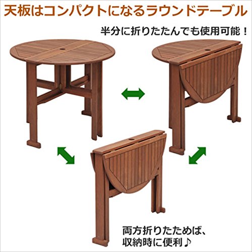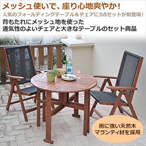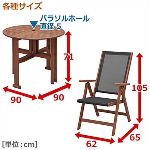 ●組立品です●天然木マランティ材を基調に仕上げたテーブル&チェア●天板はコンパクトになるラウンドテーブル●半分に折りたたんでも使用できます●チェアは通気性の良いテスリン張り地を使用●テーブル折りたたみ可能折りたたみサイズ:幅90 奥行14 高さ73.5cm●チェア折りたたみ可能折りたたみサイズ:幅62 奥行14 高さ90cm●チェア背部はリクライニング可能●パラソルホール:直径5cm