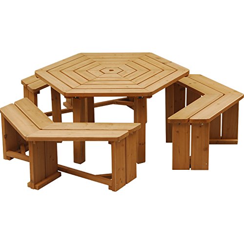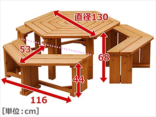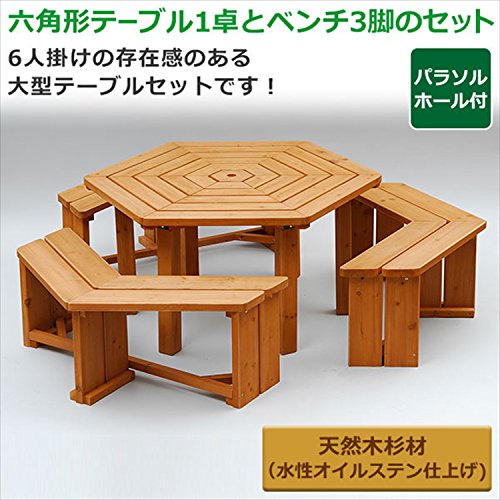 ●組立品です●六角形テーブルを囲むベンチ3脚とのセット●大人6人がゆったり座れる●パラソルホール(径:4.2cm)付き