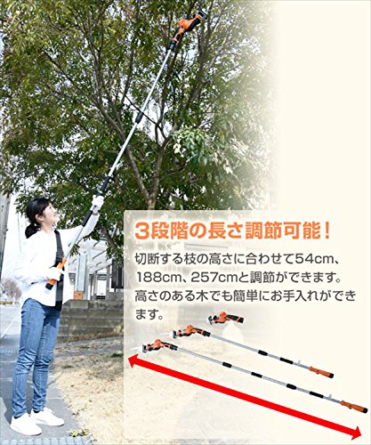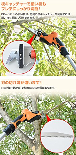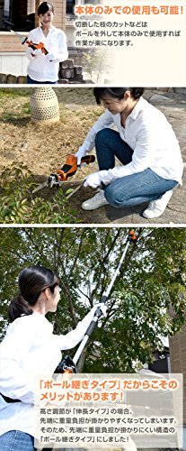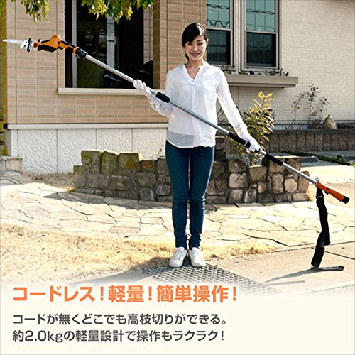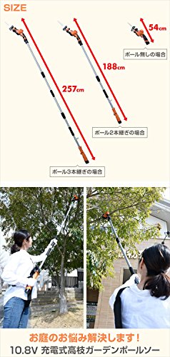 ●定格電圧:10.8V●ストローク数:約0から2500min-1●ストローク長:約20mm●作業量(目安):角材(ホワイトウッド)幅27mm×厚さ38mm 260カット※カット本数は条件によって異なります●切断能力:庭木80mm●無負荷連続作業時間:約50分●バッテリー:2.5Ah リチウム電池●充電時間:約2時間●充電器入力:AC100V 50/60Hz●入力容量:12W●充電器出力:1.5A●枝切り刃の:(刃渡り)210mm、(ピッチ)3mm、(板厚)0.9mm、無電解ニッケルメッキ、衝撃焼入れ●電源を気にせず、どこでも高枝切りができるLi-ionバッテリー2.5Ah式●切断する枝の高さに合わせて着脱ポールの接続本数を変更することで3段階の高さ調節が可能(ポール無し)54cm、(ポール2本)188cm、(ポール3本)257cm●高さ調節は「伸長タイプ」ではなく「ポール継ぎタイプ」のため、先端に重量負担が掛かりにくい構造●約2kgの軽量タイプなので作業も快適におこなえます●太枝最大約80mmの硬い枝で約26本の枝切りが可能※枝の種類、使用環境などで異なります●付属の枝キャッチャーを使用すれば細い枝の切断も簡単※20mm以上の太い枝は枝キャッチャーを外してご使用ください●木の枝や切断した枝のカットなどは本体のみでの使用が最適●トリガースイッチでスピード調節も可能●枝切り刃は安心の日本製 切れ味が違います●付属品:本体一式、バッテリー×1、専用充電器×1、210mm枝切り刃(日本製)×1、枝キャッチャー×1、保護メガネ×1、肩掛けベルト×1、取扱説明書