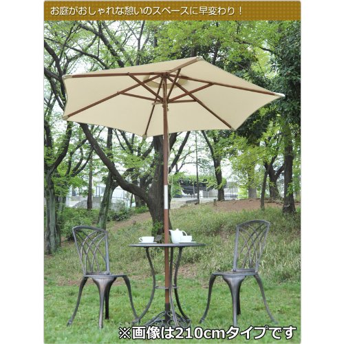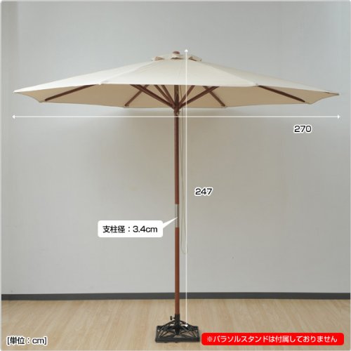 ●一部取付品です●ガーデンの日除けに便利な木製パラソル●紐を引くことで簡単に開けます●5点セットのテーブル等に最適な大型270cmタイプ●支柱径:3.7cm※パラソルスタンドは付属しておりません