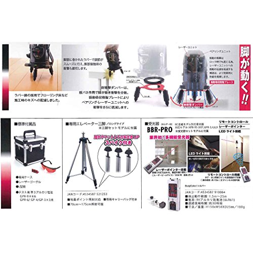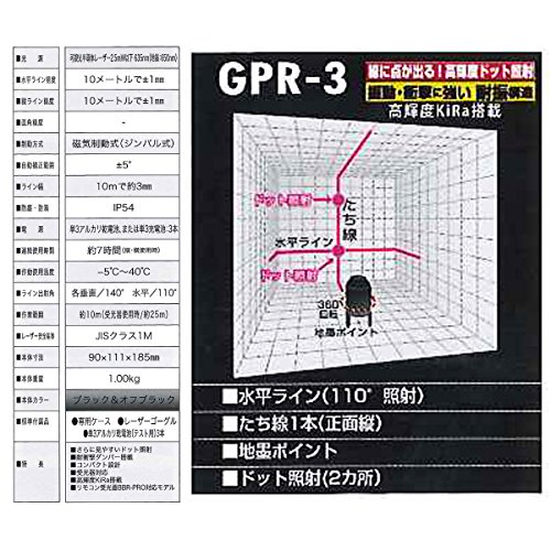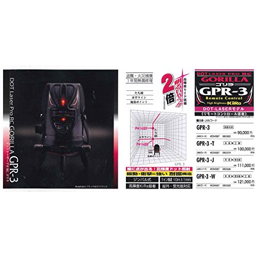 山真 GPR-3-W ラインレーザードット付 ■耐衝撃ダンパー搭載 DOTレーザープロ ゴリラ ドット照射&高輝度kira搭載 ■GPR-3-W-DOT(受光器・三脚付きフルセット) 当店は山真の最高ランク販売店!! アフターサービス完璧!! もちろんメーカー保証1年間付き!! 在庫品ですので即出荷OKです!! 新型受光器BBR-PRO搭載モデル! 業界初!ライン切り替えリモコン、LEDライト、レーザーポインター搭載! スペック仕様詳細 ■光源 可視光半導体レーザー2.5mW以下635nm(地墨:650nm) ■水平ライン精度 10メートルで±1mm ■縦ライン精度 10メートルで±1mm ■直角精度 90°±0.012° ■制動方式 磁気制動方式(ジンバル式) ■自動補正範囲 ±5° ■ライン幅 10mで約3mm ■防塵・防滴 IP54 ■電源 単3アルカリ乾電池、または単3充電池4本 ■連続使用時間 約7時間(縦横使用時) ■作動使用温度 -5~40℃ ■ライン出射角 垂直140° 水平110° ■作業範囲 屋内約10m 屋外約25m(受光器使用時) ■レーザー安全基準 JISクラス1M ■本体寸法 90x111x185mm ■本体重量 1.00kg <標準付属品> ●新型受光器BBR-PRO ●レーザーゴーグル●L型板●単3アルカリ電池(テスト用) ●専用ケース ●エレベーター三脚