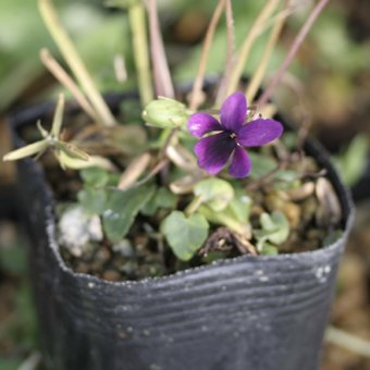 ミョウジンスミレは、神奈川県の箱根明神ケ岳原産の濃色小型タイプのスミレです。花の中央にかけて黒味がかります。鉢植えや寄せ植え、お庭などに合います。