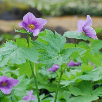 - 「白根葵(しらねあおい)」は、日本の山野草を代表する花で、春先に桃色から薄紫の大きな花を咲かせます。北海道~本州(中部、北部)の山地~亜高山の草地や明るい林内に生えます。和名の由来は、日光の白根山に多く自生することから。