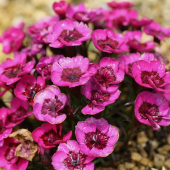 「御山撫子(おやまなでしこ)」は、春先に濃赤紫色の花を咲かせるナデシコの仲間です。マットな草丈で大きな花を咲かせるので、鉢植えやロックガーデンに向きます。学名はダイアンサス・アルピナスで、ヨーロッパアルプスの標高1000~2500mの草地に生えます。