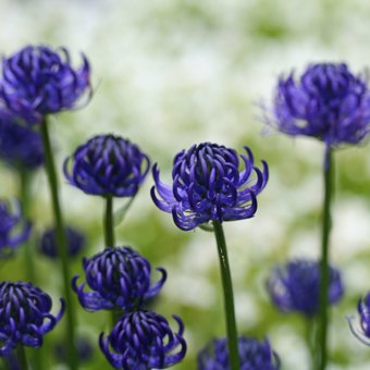 クロバナタマシャジンは、一般のタマシャジンよりも色が濃く、つぼみの頃は深みのある濃紺で花が開くと青紫色になります。花は大きく、茎がしっかりしているので鉢植え、庭植えどちらにも向きます。ヨーロッパアルプス原産。学名・フィテウマ・オルビクラレ。株分けで増やしましょう。